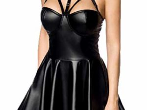 Frauen Erotisches Damen Bänderoutfit aus Mini-Kleid ausgestellt und Ösen in Wetlook schwarz Harness Set elastisch
